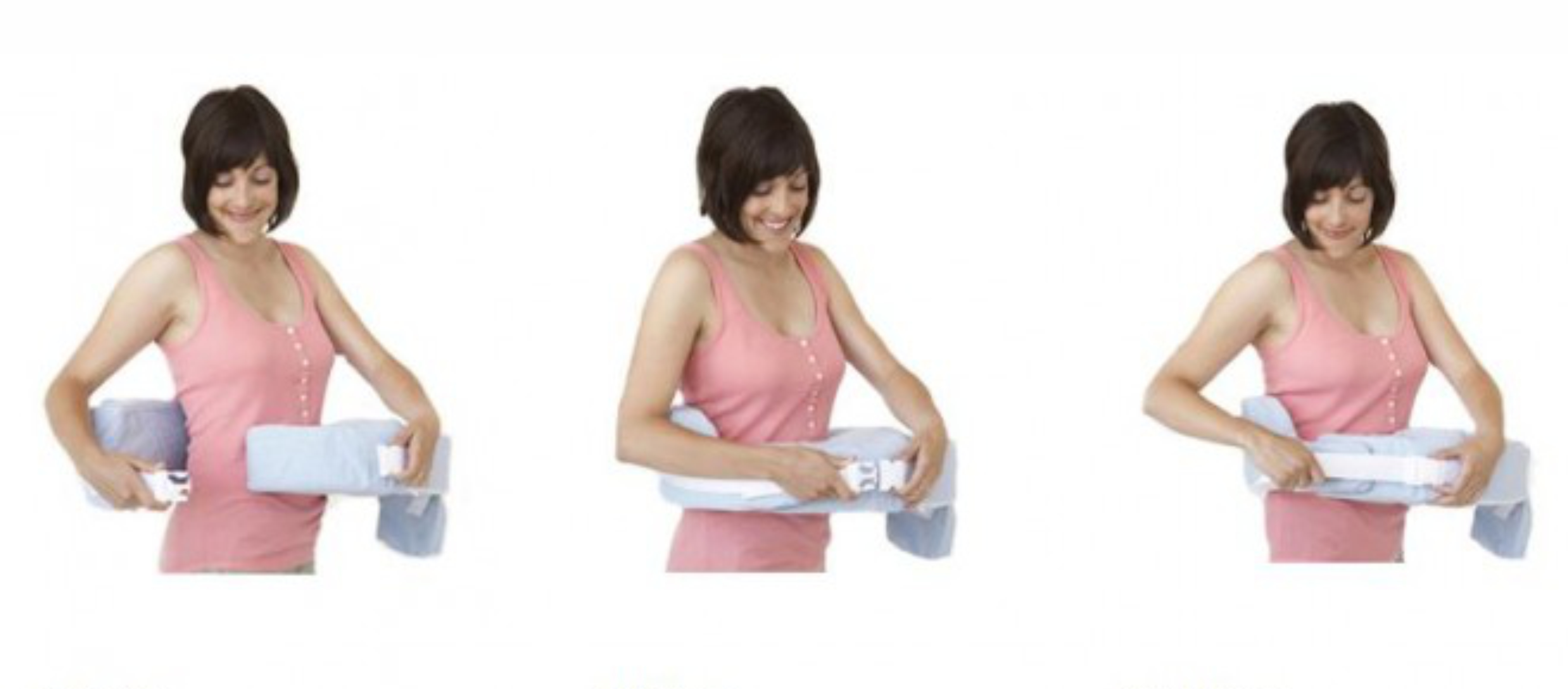 1.krok: Obepněte si polštář kolem pasu tak, abyste měla sponu po pravé ruce a podpěrka zad se dotýkala vašich beder.